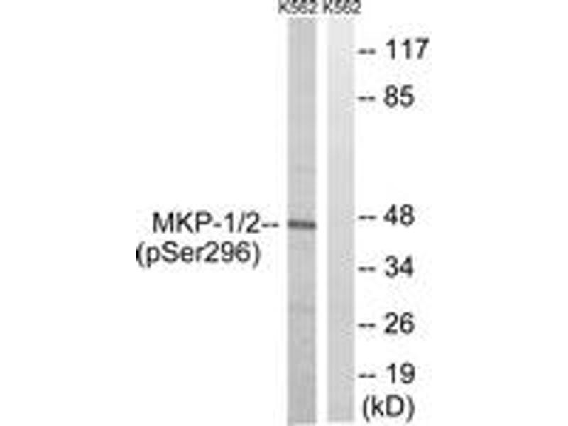 MKP-1/2 (Phospho-Ser296/318) Antibody detects endogenous levels of MKP-1/2 only when phosphorylated at Ser296/318.