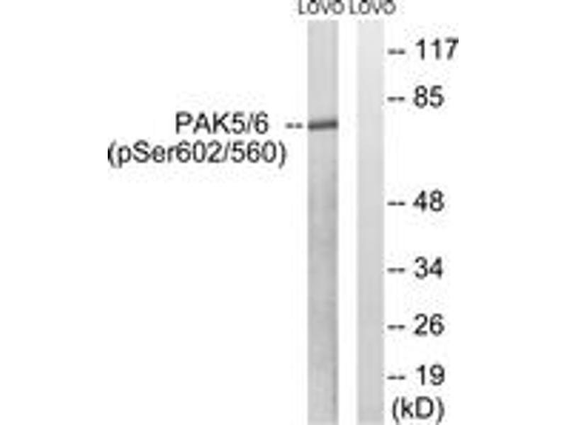 PAK5/6 (Phospho-Ser602/Ser560) Antibody detects endogenous levels of PAK5/6 only when phosphorylated at Ser602/560.