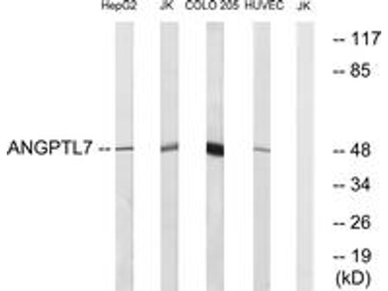 - The antiserum was produced against synthesized peptide derived from human ANGPTL7.