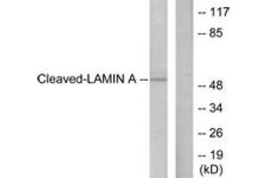 Lamin A (Cleaved-Asp230) Antibody detects endogenous levels of fragment of activated Lamin A resulting from cleavage adjacent to Asp230.
