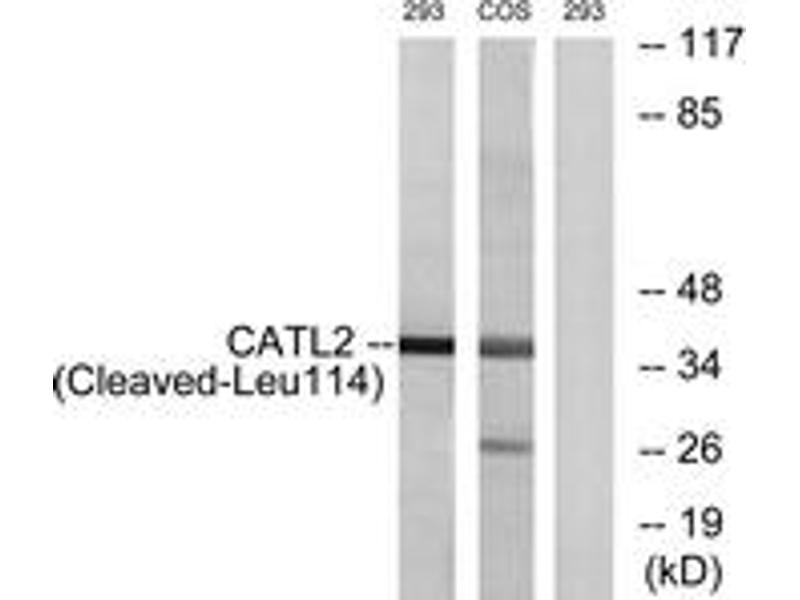 CATL2 (Cleaved-Leu114) Antibody detects endogenous levels of fragment of activated CATL2 resulting from cleavage adjacent to Leu114.