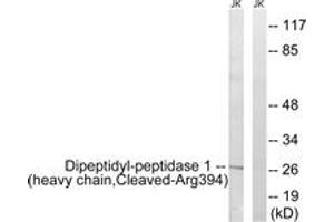 Dipeptidyl-peptidase 1 (heavy chain,Cleaved-Arg394) Antibody detects endogenous levels of fragment of activated Dipeptidyl-peptidase 1 resulting from cleavage adjacent to Arg394.