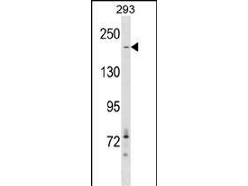 This ACACA antibody is generated from rabbits immunized with a KLH conjugated synthetic peptide between 2010-2039 amino acids from the C-terminal region of human ACACA.