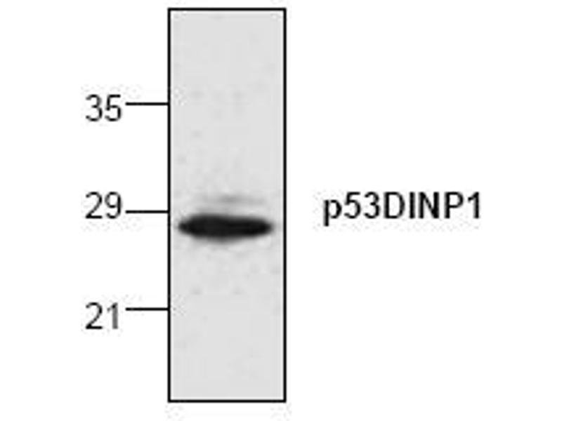 P53DINP1 (p53-dependent damage-inducible nuclear protein 1) encodes two proteins termed p53DINP1-alpha (27 kDa) and p53DINP1-beta (18 kDa). p53DINP1 may regulate p53-dependent apoptosis through phosphorylation at Ser46 and induction of p53AIP1. p53DINP1 is expressed in many tissues and induced by a variety of stress agents including UV stress, mutagenic stress, heat shock, and oxidative stress.Synonyms: P53DINP1, SIP, Stress-induced protein, Tumor protein p53-inducible nuclear protein 1, p53-dependent damage-inducible nuclear protein 1, p53-inducible nuclear protein 1