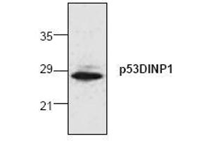 The antibody detects the 27 kDa p53DINP1-alpha. A lower band (~18 kDa) which represents the p53DINP1-beta was also detected in certain tissue and cells.