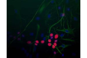 Fox3 is one of a family of mammalian homologues of Fox-1, which was originally discovered in C. elegans as a gene involved in sex determination. Fox is an acronym of Feminizing locus on X. The mammalian genome contains three genes homologous to C. elegans Fox-1, usually called Fox1, Fox2 and Fox3. All these Fox proteins are about 46 kDa in size, and each includes a central highly conserved RRM type RNA recognition motif. This motif corresponds to a small approx. 70 amino acid structure consisting of 4 beta strands and two alpha-helices. An alternate name for Fox3 is hexaribonucleotide binding protein 3, and the Fox proteins are believed to have a role in the regulation of mRNA splicing. Much interest has focused on Fox3 as a result of the recent finding that this protein corresponds to NeuN, a neuronal nuclear antigen. NeuN was first described in 1994 by Mullen et al., who raised a series of monoclonal antibodies to mouse antigens with the original intent of finding mouse species specific markers useful for transplantation experiments. In the event they obtained a clone, called mAb A60, which proved to bind an antigen expressed only in neuronal nuclei and to a lesser extent the cytoplasm of neuronal cells, and which appeared to work on all vertebrates. A few neuronal cell types were not recognized by the the NeuN antibody, such as cerebellar Purkinje cells, olfactory Mitral cells and retinal photoreceptors. However the vast majority of neurons are strongly NeuN positive, and NeuN immunoreactivity has been widely used to measure the neuron/glial ratio in brain regions. The protein bound by this antibody was not characterized, though the molecular weight of this protein was shown to be closely spaced bands running at 46-48 kDa on SDS-PAGE gels. The exact identity of the NeuN protein was not elucidated in this paper or, despite several attempts, for may years later. Despite this the mAb A66 antibody has become very widely used as a robust marker of neurons and neuronal stem cells, and a recent medline search using the keyword neun produced over 1,100 hits. Recently Kim et al. used proteomic methods to show that NeuN corresponds to Fox3. NeuN/Fox-3 is therefore a protein which has a function in RNA splicing and is expressed heavily and specifically in neuronal nuclei and cytoplasm. Our antibody was raised against the N-terminal 100 amino acids of human Fox3 as expressed in and purified from E. coli. We did not use full length Fox3 as immunogen since the three mammalian Fox homologues, namely Fox1, Fox2 and Fox3, include virtually identical RRM motifs. The N-terminal region of the three molecules are much more variable in the three molecules so antibodies specific for each of the three molecules can therefore be generated. The HGNC name for this protein is RBFOX3.