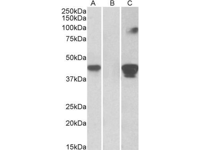 Western Blot: In transfected HEK293 transiently expressing Human SLAMF8 (myc and DYKDDDDK tagged), a band of approx. 45 kDa is observed. No bands are observed in mock-transfected HEK293 and the same band is observed using anti-myc antibody. Recommended c