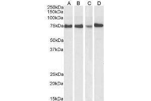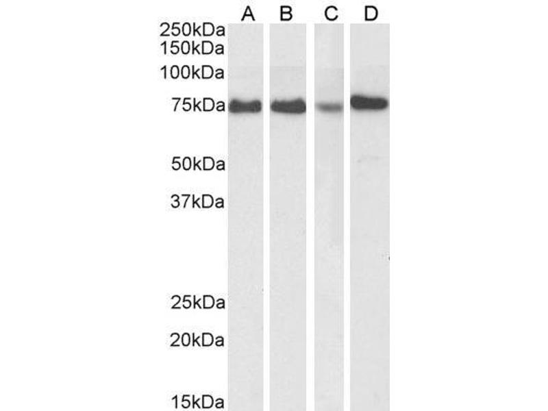 Western Blot: Approx 75-80 kDa band observed in lysates of cell lines HeLa and MCF7, and in HeLa and Jurkat nuclear cell lysates (calculated MW of 74.6 kDa according to NP_031374.2). Recommended concentration: 0.3-2 μg/mL. Primary incubation 1 hour at room