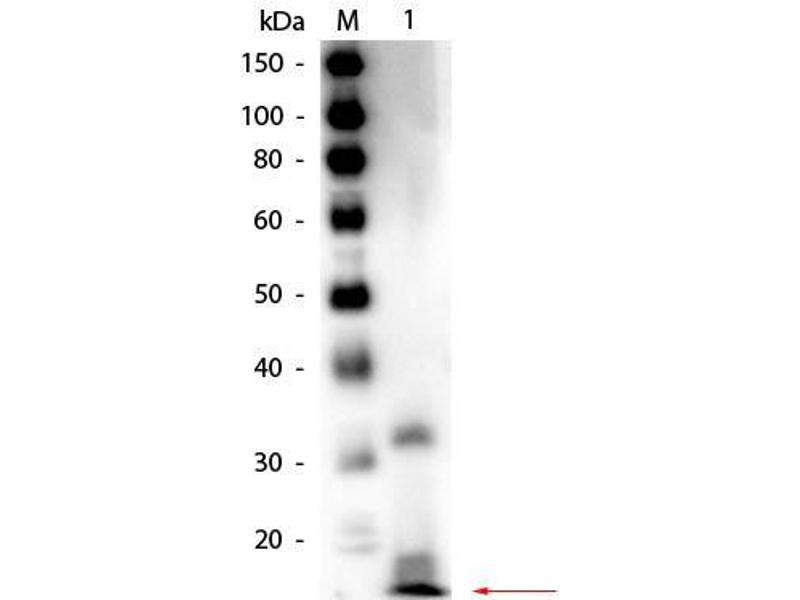 Application Note: Anti-Ribonuclease A Biotin Conjugated antibody has been tested by ELISA and western blot. This product is assayed against 1.0 μg of Ribonuclease A in a standard capture ELISA using Peroxidase Conjugated Streptavidin #S000-03 and ABTS (2,2'-azino-bis-[3-ethylbenthiazoline-6-sulfonic acid]) code # ABTS-100 as a substrate for 30 minutes at room temperature. A working dilution of 1:3,000 to 1:13,000 of the reconstitution concentration is suggested for this product.