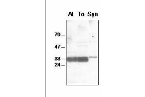 Higher plants. According to sequence homology antisera may reacts in Synechocystis only with PsbA2/3 but not with PsbA1. For analysis of cyanobacterial D1 proteins the dilution 1: 1.000 is recommended.