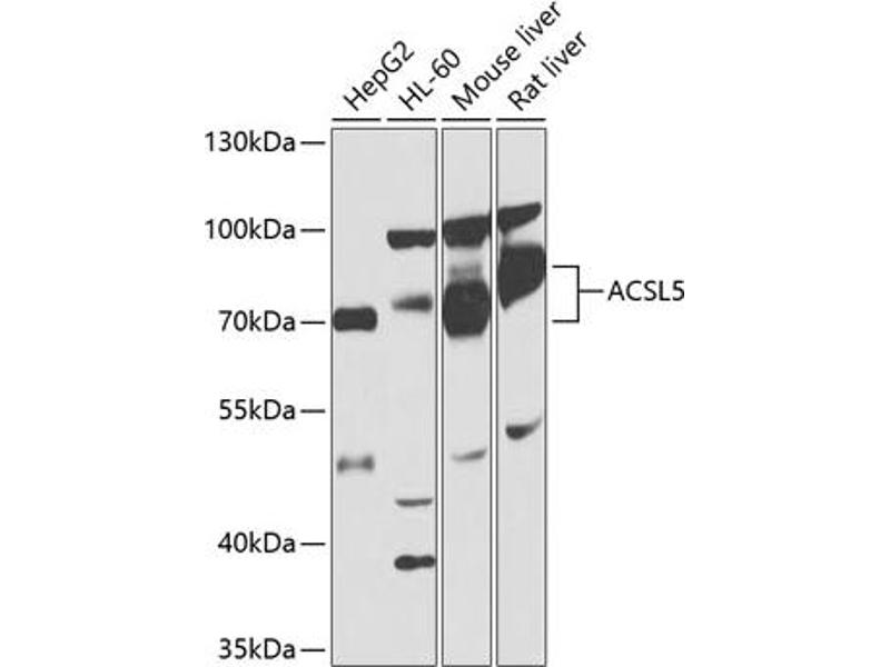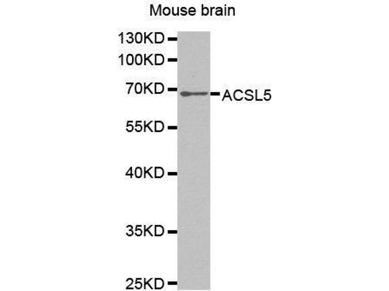 The protein encoded by this gene is an isozyme of the long-chain fatty-acid-coenzyme A ligase family. Although differing in substrate specificity, subcellular localization, and tissue distribution, all isozymes of this family convert free long-chain fatty acids into fatty acyl-CoA esters, and thereby play a key role in lipid biosynthesis and fatty acid degradation. This isozyme is highly expressed in uterus and spleen, and in trace amounts in normal brain, but has markedly increased levels in malignant gliomas. This gene functions in mediating fatty acid-induced glioma cell growth. Three transcript variants encoding two different isoforms have been found for this gene.,ACSL5,ACS2,ACS5,FACL5,Cancer,Signal Transduction,Endocrine & Metabolism,Lipid Metabolism,ACSL5