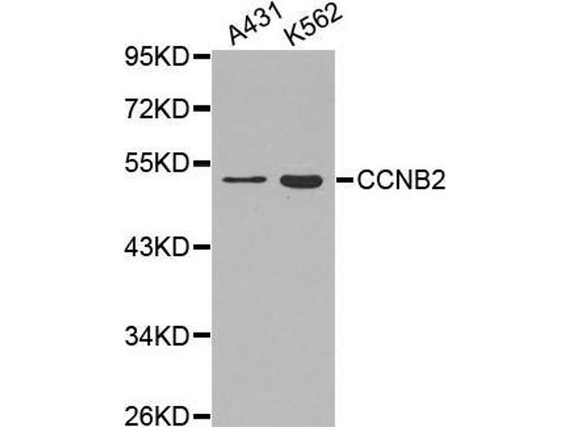 Cyclin B2 is a member of the cyclin family, specifically the B-type cyclins. The B-type cyclins, B1 and B2, associate with p34cdc2 and are essential components of the cell cycle regulatory machinery. B1 and B2 differ in their subcellular localization. Cyclin B1 co-localizes with microtubules, whereas cyclin B2 is primarily associated with the Golgi region. Cyclin B2 also binds to transforming growth factor beta RII and thus cyclin B2/cdc2 may play a key role in transforming growth factor beta-mediated cell cycle control.,CCNB2,HsT17299,cyclin B2,Epigenetics & Nuclear Signaling,Cell Biology & Developmental Biology,Cell Cycle,Centrosome,Cyclins,G2/M DNA Damage Checkpoint,CCNB2