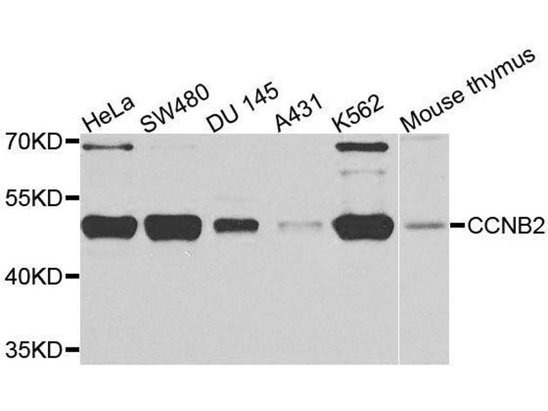This Rabbit Polyclonal antibody specifically detects Cyclin B2 in WB and IHC. It exhibits reactivity toward Human. It has been mentioned in 2+ publications