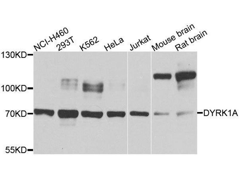 This gene encodes a member of the Dual-specificity tyrosine phosphorylation-regulated kinase (DYRK) family. This member contains a nuclear targeting signal sequence, a protein kinase domain, a leucine zipper motif, and a highly conservative 13-consecutive-histidine repeat. It catalyzes its autophosphorylation on serine/threonine and tyrosine residues. It may play a significant role in a signaling pathway regulating cell proliferation and may be involved in brain development. This gene is a homolog of Drosophila mnb (minibrain) gene and rat Dyrk gene. It is localized in the Down syndrome critical region of chromosome 21, and is considered to be a strong candidate gene for learning defects associated with Down syndrome. Alternative splicing of this gene generates several transcript variants differing from each other either in the 5' UTR or in the 3' coding region. These variants encode at least five different isoforms.,DYRK1A,DYRK,DYRK1,HP86,MNB,MNBH,MRD7,Signal Transduction,Kinase,Neuroscience,DYRK1A