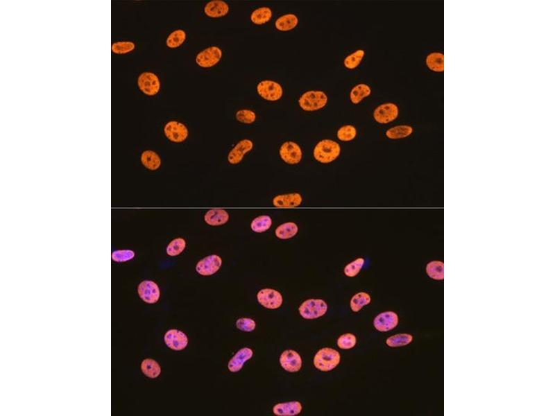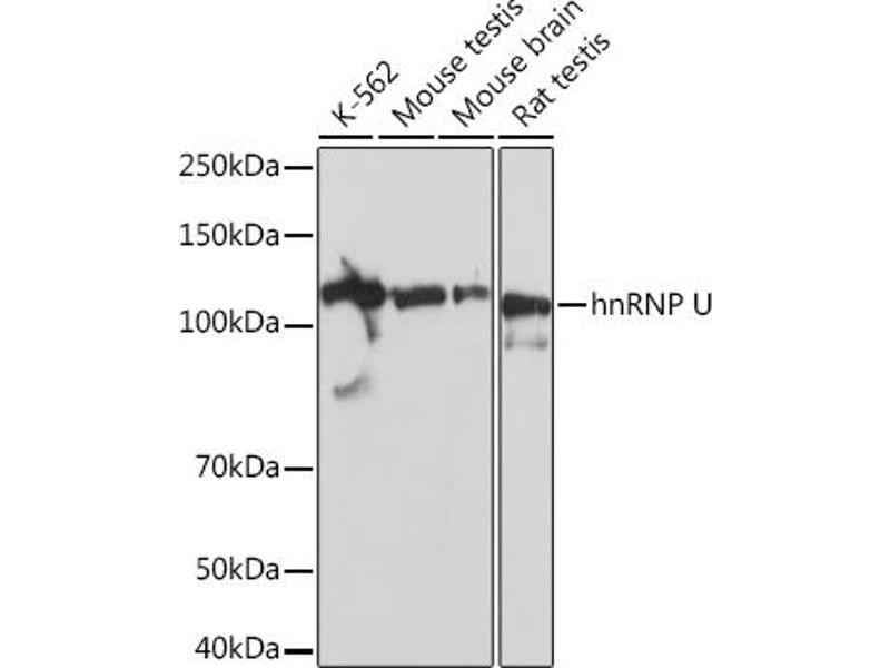 This gene belongs to the subfamily of ubiquitously expressed heterogeneous nuclear ribonucleoproteins (hnRNPs). The hnRNPs are RNA binding proteins and they form complexes with heterogeneous nuclear RNA (hnRNA). These proteins are associated with pre-mRNAs in the nucleus and appear to influence pre-mRNA processing and other aspects of mRNA metabolism and transport. While all of the hnRNPs are present in the nucleus, some seem to shuttle between the nucleus and the cytoplasm. The hnRNP proteins have distinct nucleic acid binding properties. The protein encoded by this gene contains a RNA binding domain and scaffold-associated region (SAR)-specific bipartite DNA-binding domain. This protein is also thought to be involved in the packaging of hnRNA into large ribonucleoprotein complexes. During apoptosis, this protein is cleaved in a caspase-dependent way. Cleavage occurs at the SALD site, resulting in a loss of DNA-binding activity and a concomitant detachment of this protein from nuclear structural sites. But this cleavage does not affect the function of the encoded protein in RNA metabolism. At least two alternatively spliced transcript variants have been identified for this gene. [provided by RefSeq, Jul 2008],EIEE54, HNRNPU-AS1, HNRPU, SAF-A, SAFA, U21.1, hnRNP U,Epigenetics & Nuclear Signaling,RNA Binding,HNRNPU