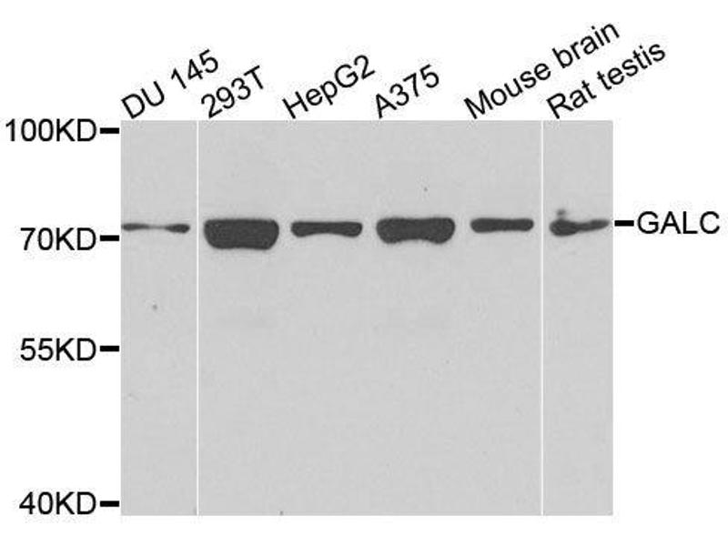 This gene encodes a lysosomal protein which hydrolyzes the galactose ester bonds of galactosylceramide, galactosylsphingosine, lactosylceramide, and monogalactosyldiglyceride. Mutations in this gene have been associated with Krabbe disease, also known as globoid cell leukodystrophy. Alternate transcriptional splice variants, encoding different isoforms, have been characterized.,GALC,Cancer,Signal Transduction,Endocrine & Metabolism,Lipid Metabolism,Hydrolysis,Neuroscience,Cell Type Marker,Neurodegenerative Diseases,Cardiovascular,Lipids,Neuron marker,GALC