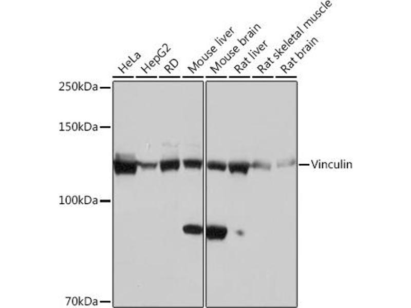 Vinculin is a cytoskeletal protein associated with cell-cell and cell-matrix junctions, where it is thought to function as one of several interacting proteins involved in anchoring F-actin to the membrane. Defects in VCL are the cause of cardiomyopathy dilated type 1W. Dilated cardiomyopathy is a disorder characterized by ventricular dilation and impaired systolic function, resulting in congestive heart failure and arrhythmia. Multiple alternatively spliced transcript variants have been found for this gene, but the biological validity of some variants has not been determined. [provided by RefSeq, Jul 2008],CMD1W, CMH15, HEL114, MV, MVCL,Cardiovascular,Cell Biology & Developmental Biology,Cytoskeleton,Cytoskeleton_Actins,Cytoskeleton_Microfilaments,Heart,Heart_Cardiac arrhythmias,Heart_Contractility,Signal Transduction,VCL