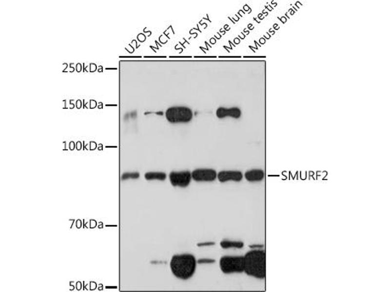 E3 ubiquitin-protein ligase which accepts ubiquitin from an E2 ubiquitin-conjugating enzyme in the form of a thioester and then directly transfers the ubiquitin to targeted substrates. Interacts with SMAD7 to trigger SMAD7-mediated transforming growth factor beta/TGF-beta receptor ubiquitin-dependent degradation, thereby downregulating TGF-beta signaling. In addition, interaction with SMAD7 activates autocatalytic degradation, which is prevented by interaction with AIMP1. Also forms a stable complex with TGF-beta receptor-mediated phosphorylated SMAD1, SMAD2 and SMAD3, and targets SMAD1 and SMAD2 for ubiquitination and proteasome-mediated degradation. SMAD2 may recruit substrates, such as SNON, for ubiquitin-dependent degradation. Negatively regulates TGFB1-induced epithelial-mesenchymal transition and myofibroblast differentiation.,SMURF2, E3 ubiquitin-protein ligase SMURF2,Cell Biology & Developmental Biology,Endocrine & Metabolism,Epigenetics & Nuclear Signaling,Immunology & Inflammation,Mitochondrial metabolism,Signal Transduction,Stem Cells,TGF-b-Smad Signaling Pathway,Ubiquitin,Ubiquitin_Ubiquitin-Proteasome Signaling Pathway,SMURF2