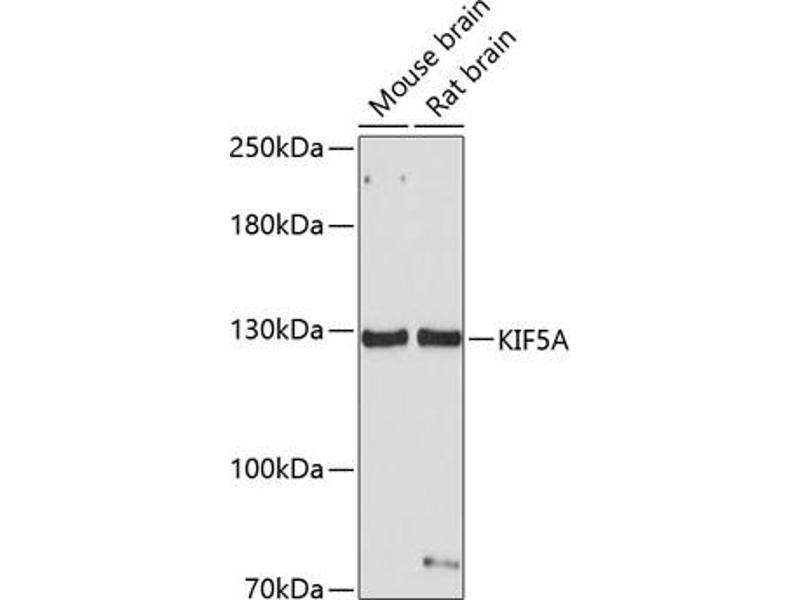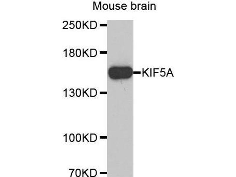 This gene encodes a member of the kinesin family of proteins. Members of this family are part of a multisubunit complex that functions as a microtubule motor in intracellular organelle transport. Mutations in this gene cause autosomal dominant spastic paraplegia 10.,KIF5A,D12S1889,MY050,NEIMY,NKHC,SPG10,Signal Transduction,Cell Biology & Developmental Biology,Cell Adhesion,Cytoskeleton,Microtubules,Motor Proteins,Neuroscience,Cell Type Marker,Neuron marker,Axon marker,KIF5A