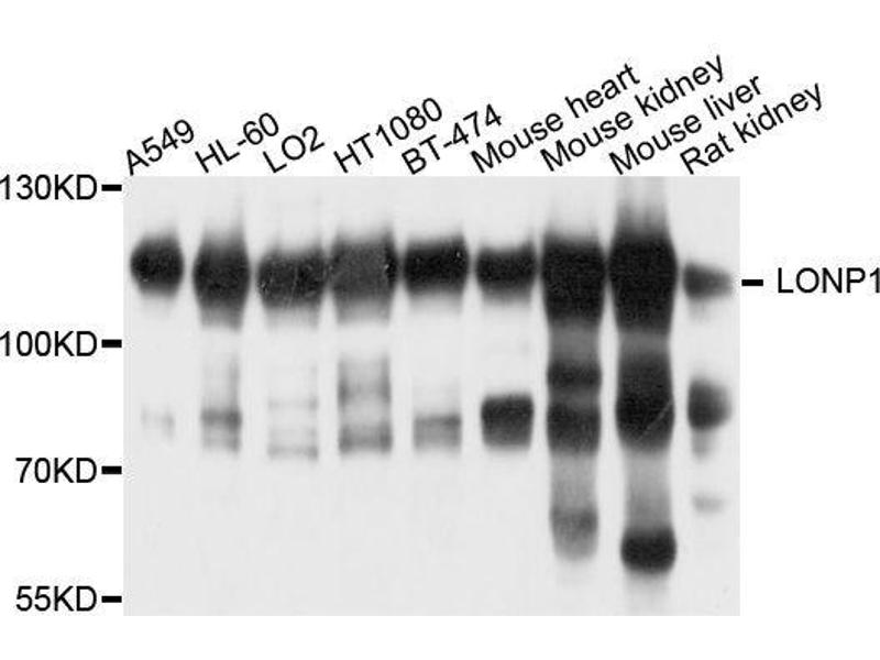 This gene encodes a mitochondrial matrix protein that belongs to the Lon family of ATP-dependent proteases. This protein mediates the selective degradation of misfolded, unassembled or oxidatively damaged polypeptides in the mitochondrial matrix. It may also have a chaperone function in the assembly of inner membrane protein complexes, and participate in the regulation of mitochondrial gene expression and maintenance of the integrity of the mitochondrial genome. Decreased expression of this gene has been noted in a patient with hereditary spastic paraplegia (PMID:18378094). Alternatively spliced transcript variants have been found for this gene.,LONP1,CODASS,LON,LONP,LonHS,PIM1,PRSS15,hLON,Epigenetics & Nuclear Signaling,Cancer,Endocrine & Metabolism,Mitochondrial metabolism,Nucleotide metabolism,LONP1
