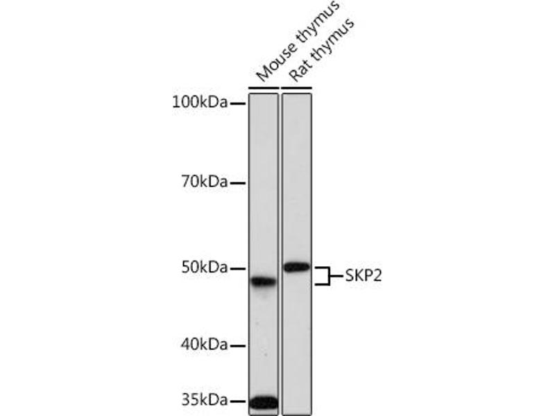 This gene encodes a member of the F-box protein family which is characterized by an approximately 40 amino acid motif, the F-box. The F-box proteins constitute one of the four subunits of ubiquitin protein ligase complex called SCFs (SKP1-cullin-F-box), which function in phosphorylation-dependent ubiquitination. The F-box proteins are divided into 3 classes: Fbws containing WD-40 domains, Fbls containing leucine-rich repeats, and Fbxs containing either different protein-protein interaction modules or no recognizable motifs. The protein encoded by this gene belongs to the Fbls class, in addition to an F-box, this protein contains 10 tandem leucine-rich repeats. This protein is an essential element of the cyclin A-CDK2 S-phase kinase. It specifically recognizes phosphorylated cyclin-dependent kinase inhibitor 1B (CDKN1B, also referred to as p27 or KIP1) predominantly in S phase and interacts with S-phase kinase-associated protein 1 (SKP1 or p19). In addition, this gene is established as a protooncogene causally involved in the pathogenesis of lymphomas. Alternative splicing of this gene generates three transcript variants encoding different isoforms. [provided by RefSeq, Jul 2011],FBL1, FBXL1, FLB1, p45,Apoptosis,Cell Biology & Developmental Biology,Kinase,Signal Transduction,Ubiquitin,Ubiquitin_Ubiquitin-Proteasome Signaling Pathway,SKP2