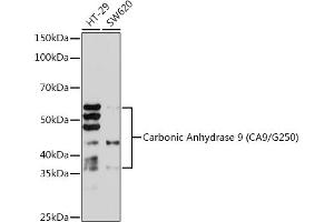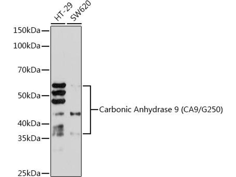 Carbonic anhydrases (CAs) are a large family of zinc metalloenzymes that catalyze the reversible hydration of carbon dioxide. They participate in a variety of biological processes, including respiration, calcification, acid-base balance, bone resorption, and the formation of aqueous humor, cerebrospinal fluid, saliva, and gastric acid. They show extensive diversity in tissue distribution and in their subcellular localization. CA IX is a transmembrane protein and is one of only two tumor-associated carbonic anhydrase isoenzymes known. It is expressed in all clear-cell renal cell carcinoma, but is not detected in normal kidney or most other normal tissues. It may be involved in cell proliferation and transformation. This gene was mapped to 17q21.2 by fluorescence in situ hybridization, however, radiation hybrid mapping localized it to 9p13-p12. [provided by RefSeq, Jun 2014],CAIX, MN,Cancer,Cardiovascular,Endocrine & Metabolism,Hypoxia,Signal Transduction,CA9