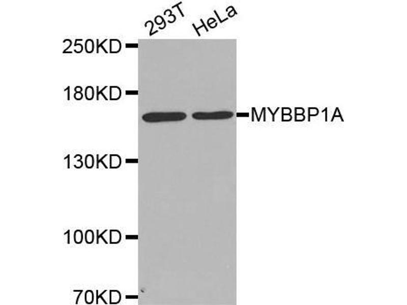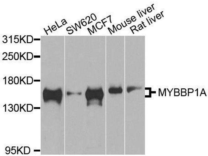 This gene encodes a nucleolar transcriptional regulator that was first identified by its ability to bind specifically to the Myb proto-oncogene protein. The encoded protein is thought to play a role in many cellular processes including response to nucleolar stress, tumor suppression and synthesis of ribosomal DNA. Alternate splicing results in multiple transcript variants.,MYBBP1A,P160,PAP2,Pol5,Epigenetics & Nuclear Signaling,RNA Binding,Cancer,Signal Transduction,MYBBP1A