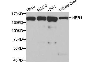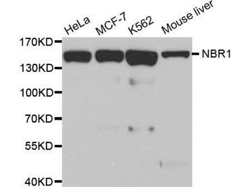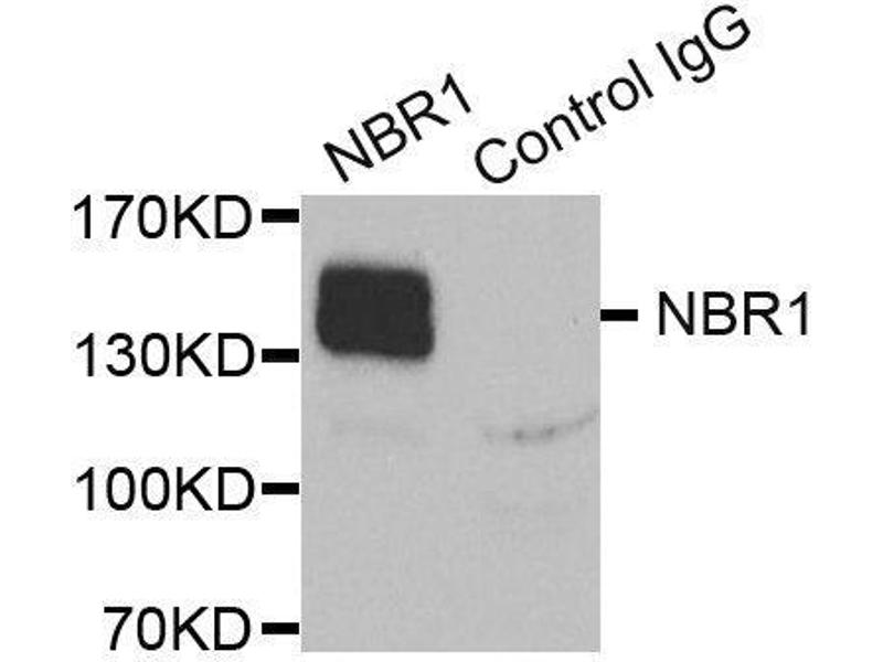 The protein encoded by this gene was originally identified as an ovarian tumor antigen monitored in ovarian cancer. The encoded protein contains a B-box/coiled-coil motif, which is present in many genes with transformation potential. It functions as a specific autophagy receptor for the selective autophagic degradation of peroxisomes by forming intracellular inclusions with ubiquitylated autophagic substrates. This gene is located on a region of chromosome 17q21.1 that is in close proximity to the BRCA1 tumor suppressor gene. Alternative splicing of this gene results in multiple transcript variants.,NBR1,1A1-3B,IAI3B,M17S2,MIG19,Cell Biology & Developmental Biology,Autophagy,Endocrine & Metabolism,Mitochondrial metabolism,Mitochondrial Control of Autophagy,NBR1