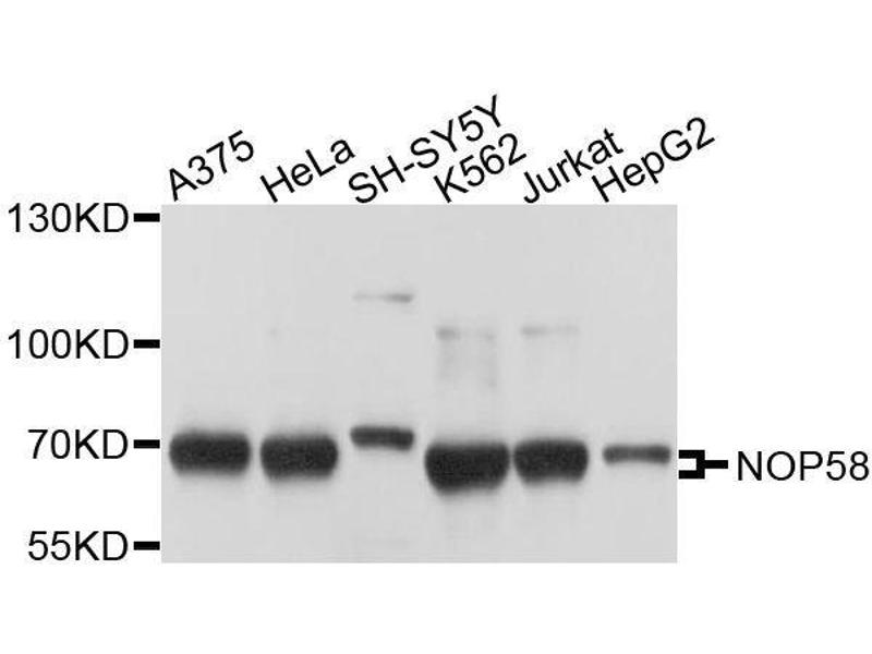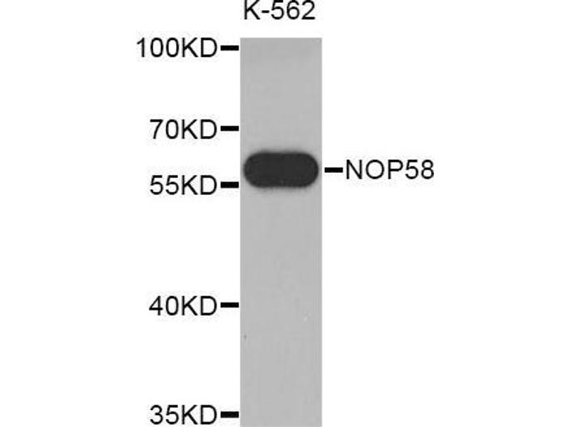 The protein encoded by this gene is a core component of box C/D small nucleolar ribonucleoproteins. Some box C/D small nucleolar RNAs (snoRNAs), such as U3, U8, and U14, are dependent upon the encoded protein for their synthesis. This protein is SUMOylated, which is necessary for high affinity binding to snoRNAs.,NOP58,HSPC120,NOP5,NOP5/NOP58,Epigenetics & Nuclear Signaling,RNA Binding,NOP58