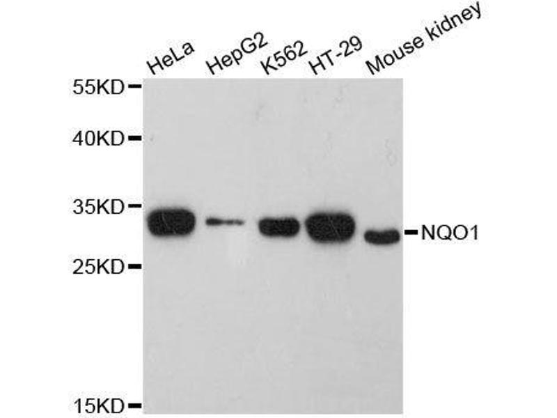 This gene is a member of the NAD(P)H dehydrogenase (quinone) family and encodes a cytoplasmic 2-electron reductase. This FAD-binding protein forms homodimers and reduces quinones to hydroquinones. This protein's enzymatic activity prevents the one electron reduction of quinones that results in the production of radical species. Mutations in this gene have been associated with tardive dyskinesia (TD), an increased risk of hematotoxicity after exposure to benzene, and susceptibility to various forms of cancer. Altered expression of this protein has been seen in many tumors and is also associated with Alzheimer's disease (AD). Alternate transcriptional splice variants, encoding different isoforms, have been characterized.,DHQU,DIA4,DTD,NMOR1,NMORI,QR1,NQO1,Epigenetics & Nuclear Signaling,RNA Binding,Cancer,Signal Transduction,Endocrine & Metabolism,Drug metabolism,NQO1