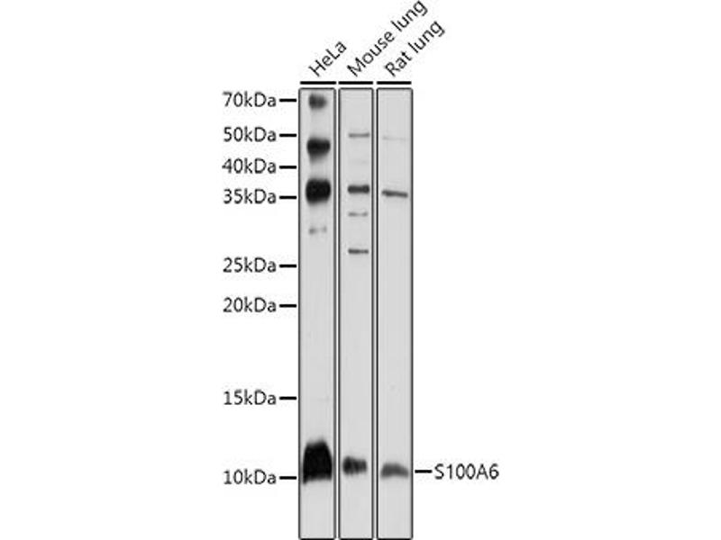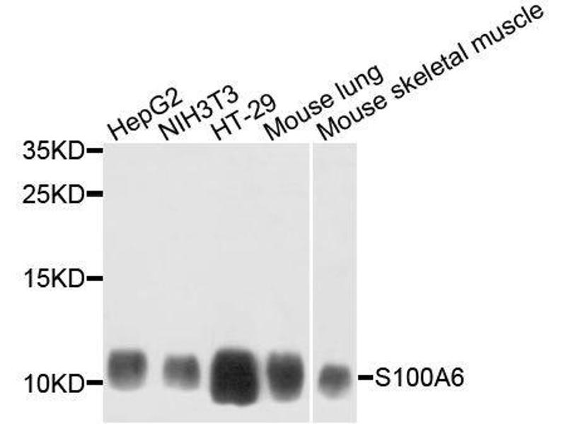 The protein encoded by this gene is a member of the S100 family of proteins containing 2 EF-hand calcium-binding motifs. S100 proteins are localized in the cytoplasm and/or nucleus of a wide range of cells, and involved in the regulation of a number of cellular processes such as cell cycle progression and differentiation. S100 genes include at least 13 members which are located as a cluster on chromosome 1q21. This protein may function in stimulation of Ca2+-dependent insulin release, stimulation of prolactin secretion, and exocytosis. Chromosomal rearrangements and altered expression of this gene have been implicated in melanoma.,S100A6,2A9,5B10,CABP,CACY,PRA,Epigenetics & Nuclear Signaling,Cell Biology & Developmental Biology,Cell Cycle,Cell differentiation,Growth factor,S100A6