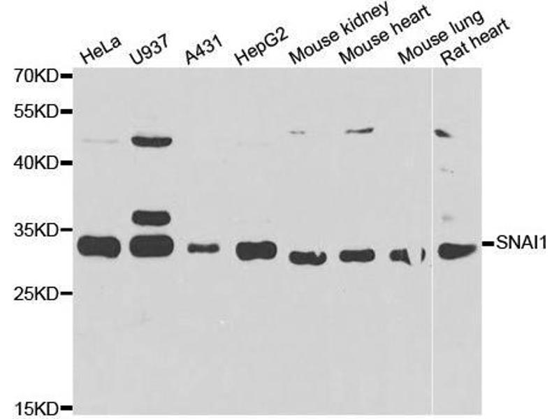 The Drosophila embryonic protein snail is a zinc finger transcriptional repressor which downregulates the expression of ectodermal genes within the mesoderm. The nuclear protein encoded by this gene is structurally similar to the Drosophila snail protein, and is also thought to be critical for mesoderm formation in the developing embryo. At least two variants of a similar processed pseudogene have been found on chromosome 2.,SNAI1,SLUGH2,SNA,SNAH,SNAIL,SNAIL1,dJ710H13.1,Epigenetics & Nuclear Signaling,Transcription Factors,Cancer,Cardiovascular,Heart,Cardiogenesis,SNAI1