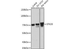 This gene encodes a serine/threonine kinase that is thought to function in the cellular stress response pathway. The kinase is activated in response to hypotonic stress, leading to phosphorylation of several cation-chloride-coupled cotransporters. The catalytically active kinase specifically activates the p38 MAP kinase pathway, and its interaction with p38 decreases upon cellular stress, suggesting that this kinase may serve as an intermediate in the response to cellular stress. [provided by RefSeq, Jul 2008],DCHT, PASK, SPAK,Cancer,Endocrine & Metabolism,Kinase,Signal Transduction,STK39