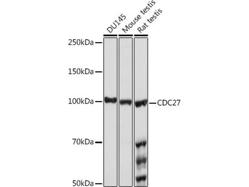 The protein encoded by this gene shares strong similarity with Saccharomyces cerevisiae protein Cdc27, and the gene product of Schizosaccharomyces pombe nuc 2. This protein is a component of the anaphase-promoting complex (APC), which is composed of eight protein subunits and is highly conserved in eukaryotic cells. This complex catalyzes the formation of cyclin B-ubiquitin conjugate, which is responsible for the ubiquitin-mediated proteolysis of B-type cyclins. The protein encoded by this gene and three other members of the APC complex contain tetratricopeptide (TPR) repeats, which are important for protein-protein interactions. This protein was shown to interact with mitotic checkpoint proteins including Mad2, p55CDC and BUBR1, and it may thus be involved in controlling the timing of mitosis. Alternative splicing of this gene results in multiple transcript variants. Related pseudogenes have been identified on chromosomes 2, 22 and Y. [provided by RefSeq, May 2014],ANAPC3, APC3, CDC27Hs, D0S1430E, D17S978E, H-NUC, HNUC, NUC2,Cell Biology & Developmental Biology,Cell Cycle,Ubiquitin,Ubiquitin_Ubiquitin-Proteasome Signaling Pathway,CDC27