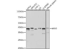 The protein encoded by this gene is a dual specificity protein kinase that belongs to the MAP kinase kinase family. This kinase is activated by mitogenic and environmental stress, and participates in the MAP kinase-mediated signaling cascade. It phosphorylates and thus activates MAPK14/p38-MAPK. This kinase can be activated by insulin, and is necessary for the expression of glucose transporter. Expression of RAS oncogene is found to result in the accumulation of the active form of this kinase, which thus leads to the constitutive activation of MAPK14, and confers oncogenic transformation of primary cells. The inhibition of this kinase is involved in the pathogenesis of Yersina pseudotuberculosis. Multiple alternatively spliced transcript variants that encode distinct isoforms have been reported for this gene. [provided by RefSeq, Jul 2008],MAPKK3, MEK3, MKK3, PRKMK3, SAPKK-2, SAPKK2,B Cell Receptor Signaling Pathway,Cancer,Cell Biology & Developmental Biology,Cell Intrinsic Innate Immunity Signaling Pathway,Cytoskeleton,Cytoskeleton_Actins,Epigenetics & Nuclear Signaling,ErbB-HER Signaling Pathway,G protein signaling,G protein signaling_G-Protein-Coupled Receptors Signaling to MAPK/Erk,IL-6 Receptor Signaling Pathway,Immunology & Inflammation,Innate Immunity_TLR Signaling,Kinase,Kinase_Serine/threonine kinases,Kinase_Tyrosine kinases,MAPK-P38 Signaling Pathway,Neurodegenerative Diseases,Neuroscience,Signal Transduction,TGF-b-Smad Signaling Pathway,Toll-like Receptor Signaling Pathway,MAP2K3