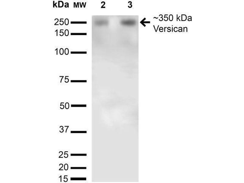 1 μg/ml of ABIN1686648 was sufficient for detection of Versican in 20 μg of mouse brain membrane lysate and assayed by colorimetric immunoblot analysis using goat anti-mouse IgG:HRP as the secondary antibody.