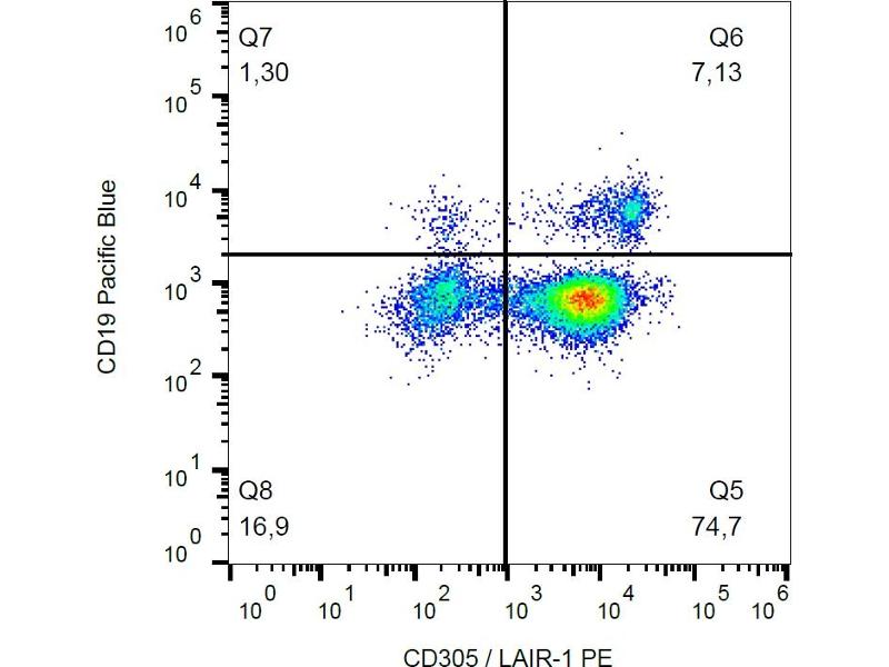 Leukocyte associated immunoglobulin like receptor,CD305, also known as LAIR1 (leukocyte-associated Ig-like receptor 1), is an inhibitory receptor found on many types of peripheral blood cells. It serves to suppress cell cytotoxicity, activation, proliferation, and differentiation regarding autoantigens via its two intracellular ITIM sites. CD305 belongs to the immunoglobulin superfamily and the leukocyte-associated inhibitory receptor family of proteins. It reacts with collagen ligands.,LAIR1
