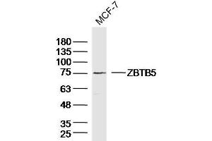 Background: Zinc-finger proteins contain DNA-binding domains and have a wide variety of functions, most of which encompass some form of transcriptional activation or repression. The majority of zinc-finger proteins contain a Kr_ppel-type DNA binding domain and a KRAB domain, which is thought to interact with KAP1, thereby recruiting histone modifying proteins. Zinc finger and BTB domain-containing protein 5 (ZBTB5) is a 677 amino acid member of the Kr_ppel C2H2-type zinc-finger protein family. Localized to the nucleus, ZBTB5 contains a BTB domain, also known as a POZ domain, which inhibits DNA binding and mediates homotypic and heterotypic dimerization. Characteristics of the BTB domain suggest that ZBTB5 functions as a transcription regulator.