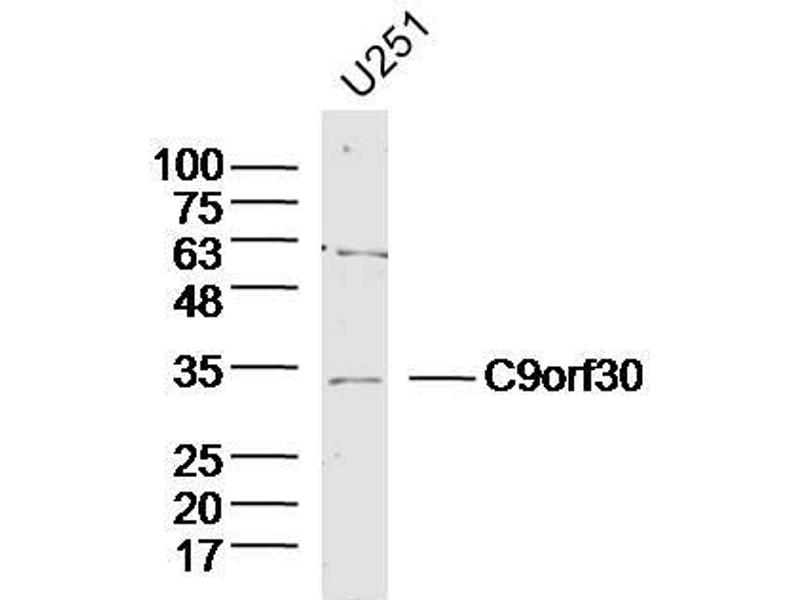 Background: C9orf30 is a 275 amino acid protein that is expressed in brain and belongs to the UPF0439 family. The gene encoding C9orf30 maps to human chromosome 9q31.1. Chromosome 9 consists of about 145 million bases, represents 4 % of the human genome and encodes nearly 900 genes. Thought to play a role in gender determination, deletion of the distal portion of 9p can lead to development of male to female sex reversal, the phenotype of a female with a male X,Y genotype. Hereditary hemorrhagic telangiectasia, which is characterized by harmful vascular defects, is associated with the chromosome 9 gene encoding endoglin protein, ENG. Familial dysautonomia is also associated with chromosome 9 though through the gene IKBKAP. Notably, chromosome 9 encompasses the largest interferon family gene cluster. Chromosome 9 is partnered with chromosome 22 in the translocation leading to the aberrant production of BCR-ABL fusion protein often found in leukemias.