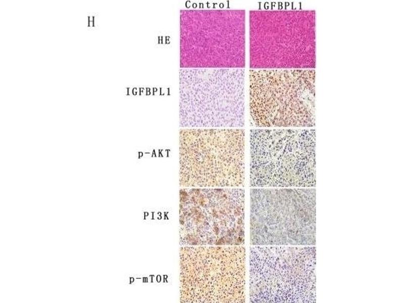Background: IGFBPL1 is a secreted IGF (Insulin-like growth factor) binding protein that is known to contain an Ig-like C2-type (immunoglobulin-like) domain, an IGFBP N-terminal domain and a Kazal-like domain. IGF-binding proteins characteristically act to extend the half-life of IGFs and may influence the growth promoting effects of the IGFs. The interaction of IGFBPs with IGFs can affect cell surface receptors, specifically, IGFBPs may enhance or decrease a cells insulin sensitivity. IGFBPL1 has been found to be down-regulated in multiple tumors and thus may be a likely tumor suppressor candidate. Highly expressed in both brain and testis, IGFBPL1 is found at lower levels in the prostate, bladder and lung.