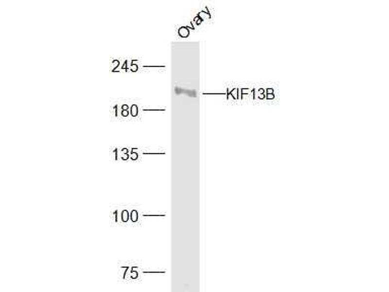Background: KIF13B is also known as Kinesin-like protein GAKIN or GAKIN and is a 1,826 amino acid protein that is widely expressed in tissues, with highest expression in brain and kidney. KIF13B is localized to the cytoplasm, as well as to the cytoskeleton, and is thought to be a microtubule-dependent motor protein which is able to bind to a variety of proteins in order to traffic them to various locations throughout the cell. KIF13B belongs to the kinesin-like protein family and possesses three domains typical of the kinesin-like protein family, namely an N-terminal motor domain with an ATP-binding motif, an FHA domain which is known to bind diverse cargos and a large stalk domain involved in protein-protein binding. Additionally, KIF13B has a microtubule-interacting sequence which is known as the CAP-Gly domain at its C-terminus. The CAP-Gly domain is highly conserved domain among eukaryotes, and in humans, defects in the CAP-Gly domain are implicated in many diseases affecting the trafficking of vesicles, neuromuscular junctions and lysosome proliferation.