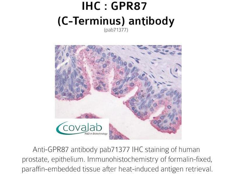 - Synthetic 19 amino acid peptide from C-terminus of human GPR87. Percent identity with other species by BLAST analysis: Human (100%), Gibbon (100%), Monkey (100%), Marmoset (100%), Mouse (100%), Rat (100%), Bovine (100%), Dog (100%), Bat (100%)