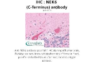 - Synthetic 18 amino acid peptide from near C-terminus of human NEK6. Percent identity with other species by BLAST analysis: Human (100%), Gorilla (89%), Orangutan (89%), Gibbon (89%), Monkey (89%), Marmoset (89%), Elephant (89%), Panda (89%), Dog (89%)