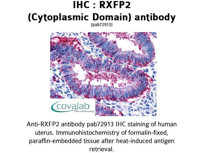 Reacts with the cytoplasmic domain of human RXFP2. Cross reacts with mouse protein. BLAST analysis of the peptide immunogen showed no homology with other human proteins.