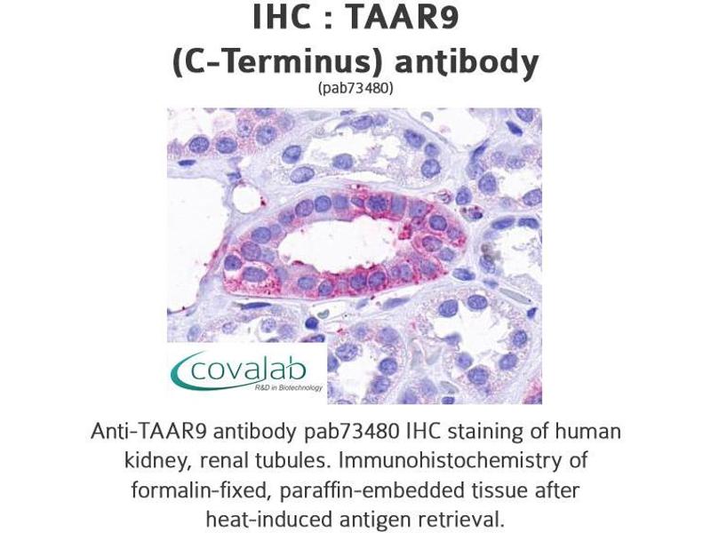 - Synthetic 16 amino acid peptide from C-terminus of human TAAR9. Percent identity with other species by BLAST analysis: Human (100%), Galago (88%).
