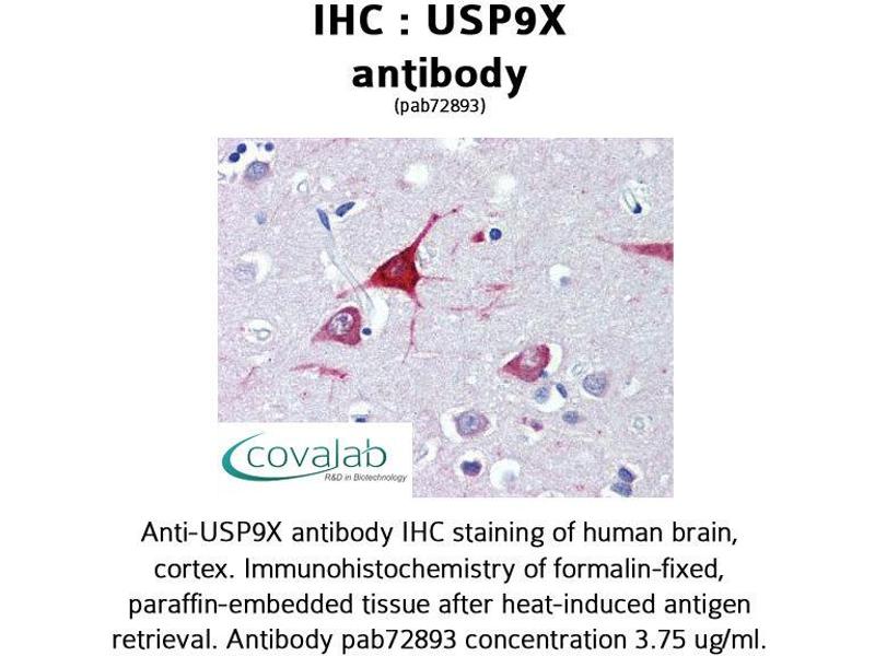 - Synthetic peptide C-KKATSVQQIEMEES from the C-terminus (near) of human USP9X (NP_001034679.2). Percent identity with other species by BLAST analysis: Human (100%), Gorilla (100%), Monkey (100%), Elephant (100%), Rabbit (93%), Mouse (86%), Horse (86%).