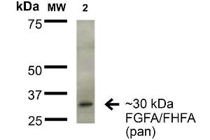 - Detects ~30 kDa. Does not cross-react with FGF13B/FHF2B. Cross reacts with FGF12A/FHF1A and FGF14A/FHF4A.