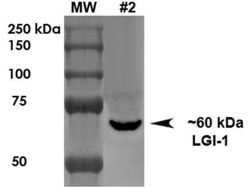 1 μg/ml of ABIN1741273 was sufficient for detection of LGI1 in 20 μg of rat brain lysate by colorimetric immunoblot analysis using Goat anti-mouse IgG:HRP as the secondary antibody.