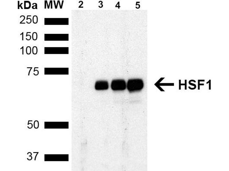 1 μg/ml of ABIN1741572 was sufficient for detection of HSF1 in 20 μg of heat shocked HeLa cell lysate by colorimetric immunoblot analysis using Rabbit anti-rat IgG: AP as the secondary antibody.