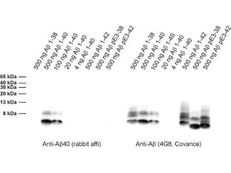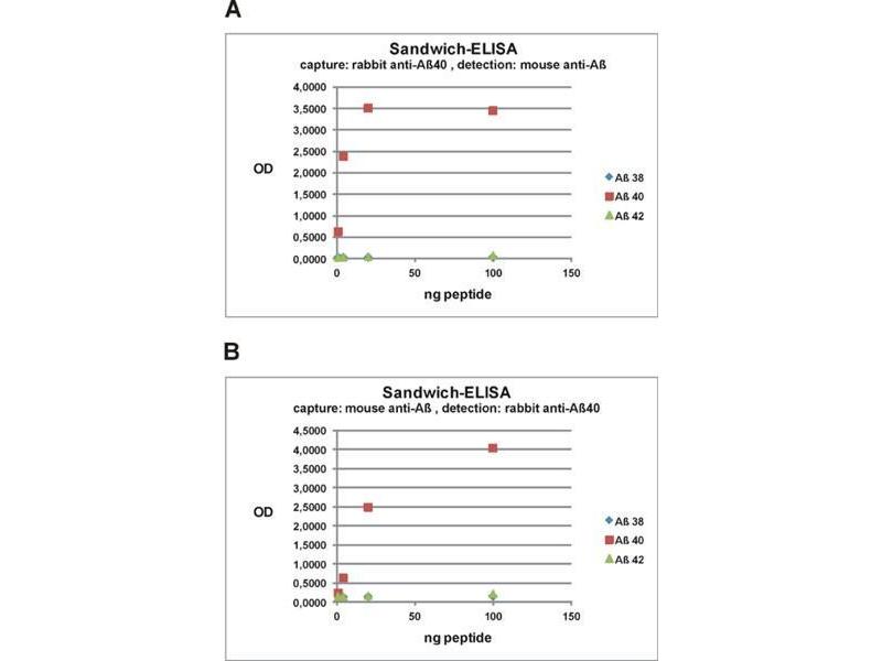 WB: Detects purified Abeta 40. Complex samples like brain extracts still have to be tested. ELISA: suitable as capture and detector antibody for sandwich-ELISA (protocol for sandwich-ELISA).